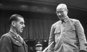 東條英機1941年出任首相,同年12月下令偷襲珍珠港,發動太平洋戰爭,日軍鐵蹄席捲東南亞,野蠻征服,蹂躪平民,殺人無數。1945年日本無條件投降後,東條英機試圖自殺失敗,被盟軍逮捕,1948年被遠東國際軍事法庭以54項戰爭罪名成立判處絞刑,是二戰三大法西斯頭目之一(與希特拉和墨索里尼並列)。