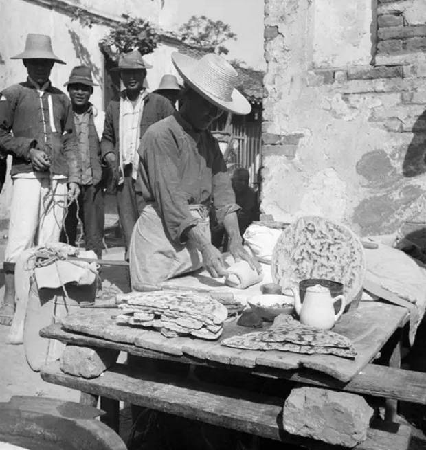 民国时期,南京,街上做葱油大饼的摊贩。海达·莫里循/摄。