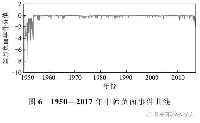 圖6展示了1950—2017年中韓Negative events曲線,可以看出,在1950—1954年朝鮮戰爭前後,中韓之間出現大量Negative events,此後兩國間Negative events較少。而2016年以來,隨著韓國部署薩德導彈防禦系統,中韓之間出現較多Negative events,使得Negative events情況近些年來較為嚴重。但根據曲線,當前中韓圍繞薩德系統出現的紛爭遠遠未達到朝鮮戰爭時期的烈度。