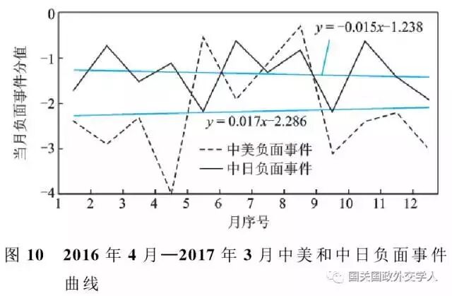 圖10顯示了最近12個月(2016年4月—2017年3月)中美和中日Negative events曲線,並對曲線進行了線性擬合。由圖可見,中美Negative events曲線的線性回歸擬合線斜率約0.017,呈改善走勢,中日Negative events曲線的線性回歸擬合線斜率約-0.015,雖然為下降走勢,但下降幅度較小。因此,可以判斷,儘管近期中美關係與中日關係中Negative events較多,但從變化趨勢看,短期內無迅速惡化的風險。從具體分值看,中美在2016年7月的Negative events分值達-4,顯然南海仲裁案對雙邊關係有明顯影響。中日Negative events則多在-2.5範圍內,可見,儘管中日圍繞釣魚島發生爭執,但兩國在進行風險管控,避免形勢惡化。