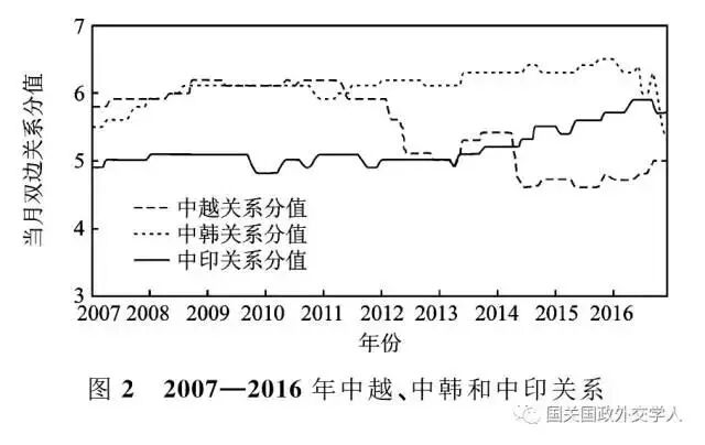 2007-2016年中越、中韓和中印關係如圖2所示。這3對雙邊關係變化幅度均在(4,7)區間,故一併比較。從變化趨勢看,中越關係呈現出與其他雙邊關係不同的走向,呈下降態勢,這與越南在南海問題上與中國的爭端有關;在美國重返亞太以來,韓國作為美國盟友,並未立刻表現出對華關係惡化的態勢;印度作為不結盟國家,其對華關係也大體呈現穩中有升的走向。