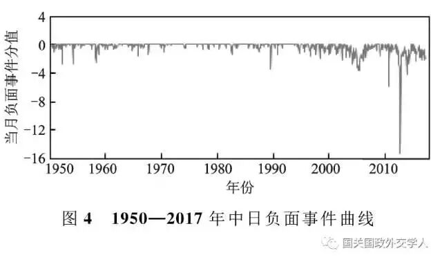 圖4給出了1950—2017年中日每月發生的Negative events曲線。由圖4可見,最近數年中日關係Negative events是1950年以來最惡劣時期,2010年中日撞船事件和2012年釣魚島爭端均使中日關係接近衝突邊緣。從Negative events分值看,2012年釣魚島爭端的Negative events分值一度達到-15左右,遠遠超過中美朝鮮戰爭時的Negative events分值(-10)。因此,可以認為,如果中日兩國在釣魚島問題上處理不善,存在衝突升級風險。