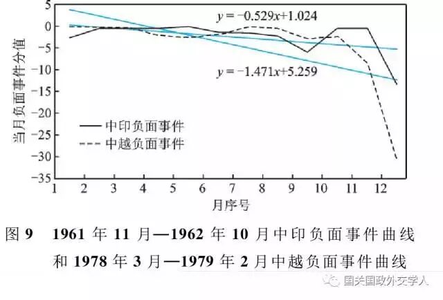 圖9繪出了1961年11月—1962年10月中印Negative events曲線和1978年3月—1979年2月中越Negative events曲線。其中,中越Negative events曲線的線性回歸擬合線的斜率約-1.471,而中印Negative events曲線的線性回歸擬合線的斜率約-0.529。顯然,中越Negative events下降更明顯,而中印關係下降較慢,可能因為中印邊界衝突前預兆較少。在戰前1個月,1962年9月的中印Negative events分值為-0.4,但此前於1962年7月中印Negative events分值達-5.9;1979年1月的中越Negative events分值為-8.4。與圖8相比,圖9的戰前下降分值比較接近,因此可以初步斷定,當某個月Negative events分值下降至-6左右時,未來數月發生衝突或戰爭的可能性較大。