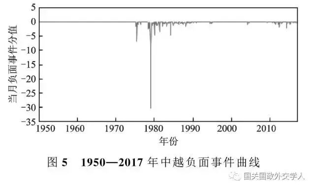 根據1950—2017年中越Negative events曲線(圖5),可以發現,2010年以來中越關係Negative events發生得比較頻繁,但不算太嚴重,月度Negative events分值未超過-3。而在20世紀70年代末中越戰爭時期,中越Negative events月度分值嚴重時達到-30。顯然,當前中越關係無明顯的衝突與戰爭預兆。