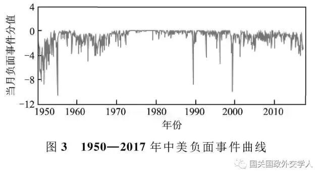 1950—2017年中美Negative events曲線如圖3所示,具體數值是每月發生的Negative events之和。由圖3明顯可見,在1950—1956年朝鮮戰爭前後、1989年冷戰結束前後和1999年中國駐南斯拉夫使館被炸事件前後,Negative events分值均處於極值點,中美關係也惡化到極點。其中,朝鮮戰爭時期是戰爭狀態,1989年和1999年處於衝突邊緣。因此,從曲線看,2010年以來,儘管中國承受來自美國的重返亞太戰略的壓力較大,但目前中美關係尚未達到衝突邊緣。