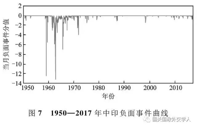 1950—2017年中印關係Negative events如圖7所示,可見,在中印邊界衝突期間,嚴重的Negative events密集爆發,但此後兩國間Negative events較少發生。自2016年以來,雖然Negative events偶有發生,但並無明顯的衝突風險。