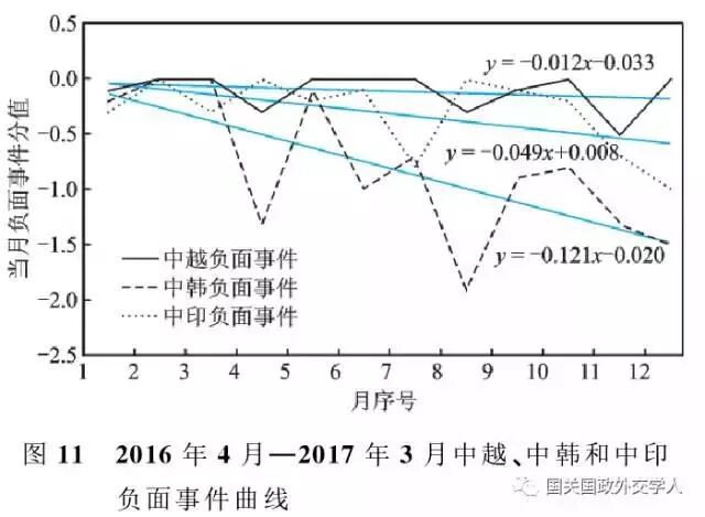 圖11繪出了2016年4月—2017年3月中越、中韓和中印Negative events曲線。根據擬合的線性公式,近1年來中韓Negative events分值下降速度最快,斜率達-0.121;中印曲線次之,斜率為-0.049;中越曲線的下降速度最慢,斜率僅為-0.012。該結果比較出乎意料,因為中越在南海問題上存在爭議,人們可能會下意識認為中越之間存在較多Negative events,但從兩國的外交事件看,近1年來中越雙方均避免出現嚴重的Negative events,可見中國與越南的衝突風險不算高。中韓之間圍繞薩德系統出現了較多Negative events,導致雙邊關係明顯惡化,但每月發生的Negative events性質不算嚴重。中印近幾個月圍繞印度核問題、達賴問題和阿魯納恰爾邦問題出現一些紛爭,導致中印Negative events曲線呈下降走勢。