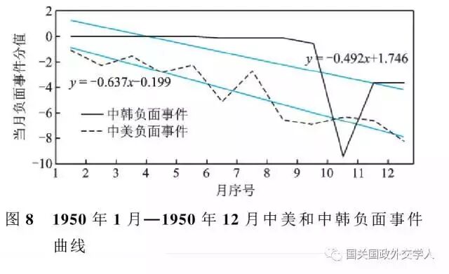 圖8給出了1950年1月—1950年12月中美和中韓Negative events曲線,為便於觀察變化趨勢,本文在圖中繪出了藍色線性擬合的趨勢線。由圖可見,朝鮮戰爭爆發前Negative events頻繁發生。在此期間,中美Negative events曲線的線性回歸擬合線的斜率約-0.637,中韓Negative events曲線的線性回歸擬合線的斜率約-0.492,顯然中美之間發生的Negative events比中韓之間的更嚴重,這也與朝鮮戰爭主要衝突方為中美雙方的實際情況相符。由於戰爭於1950年10月爆發,根據數據,在戰前1個月(即1950年9月),中美Negative events分值為-6.9。因此,可以認為,若某對雙邊關係在某個月低於-6,則戰爭風險較高。需要提醒的是,由於當時韓國是美國盟友,中國在參加朝鮮戰爭前主要施加的信號是針對美國,因此戰前1個月(1950年9月)中韓Negative events的分值並未明顯下降,到戰爭正式爆發時才開始急劇下降。