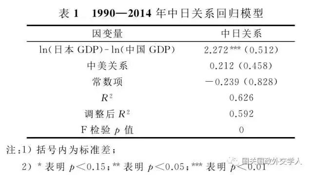 1)中日GDP差距的係數為2.272,是正數,且p<0.01,表明中日兩國GDP差距對雙邊關係有顯著的正向影響。當日本GDP高於中國GDP時,雙邊關係可能較好,反之,則兩國關係較差。