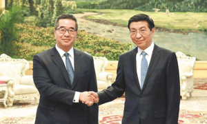 | 國民黨副主席蕭旭岑4日在北京人民大會堂會見中共中央政治局常委、全國政協主席王滬寧(右)。(國民黨提供) |