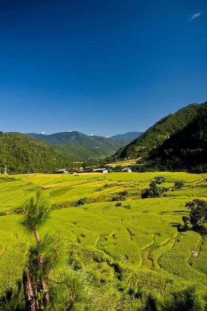河水清澈見底,清的讓人身心俱消;到處是鬱鬱蔥蔥的原始森林。全國森林覆蓋面積達百分之七十五,是世界上唯一綠地面積在不斷增加的國家。因為伐一顆樹,必須補栽兩顆,經幡隨處看見,寺院紅白相間。白的是雪,藍的是天,清的是水,綠的是山,黃的是莊稼,紅的是寺院。你走近不丹,就宛如走入遠古的童話,走入人間的仙境,走入世外桃源。