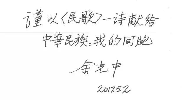 余老先生顫巍著寫下“謹以《民歌》一詩獻給中華民族:我的同胞”。
