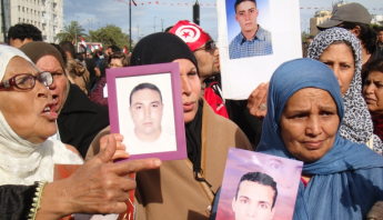 2013年,在突尼斯1月14日革命廣場的示威遊行,母親們尋找她們失蹤的孩子。林深靖攝。