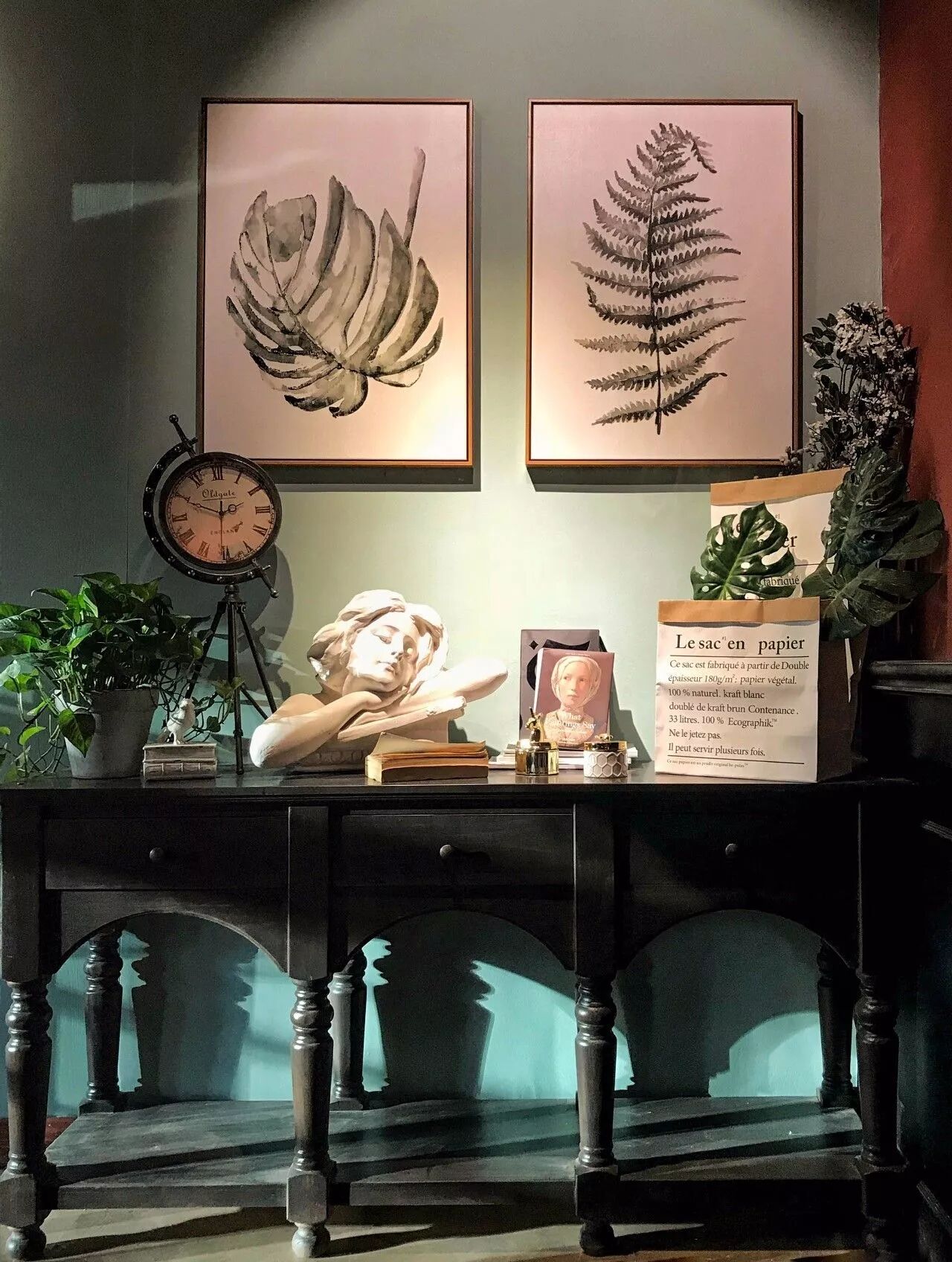 沿着黑色台阶向上走,红色墙面同样装饰着挂画和摆件。从拐角处向上看,身边的红色延伸到尽头后变成了淡绿色,映衬着淡绿背景墙的是一个趴在书上的少女雕塑和一些小摆件。
