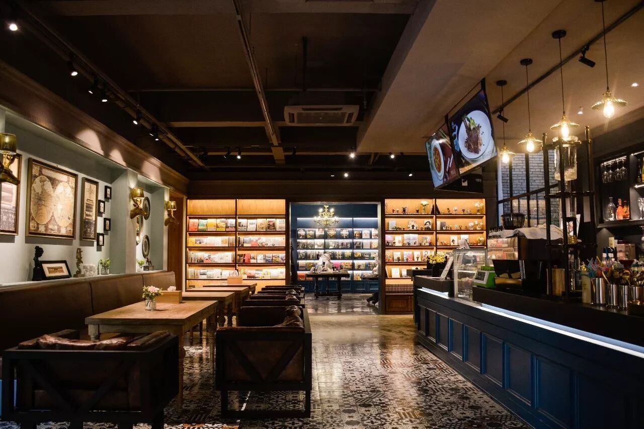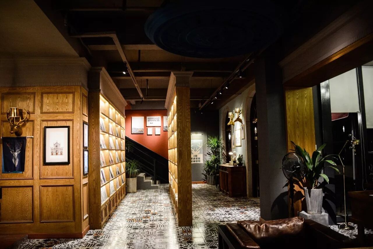 从门口的区域往里走,是吧台和一片客座区,客人可以在此阅读或是进餐。马卡龙淡绿墙面分散了棕色桌椅的厚重,墙面的复古装饰和鹿首灯又带来自在随意的悠闲感。阅读灯的贴心设置,让你只想深深陷在舒适的皮质沙发里,安静在书中无人打扰地神游。