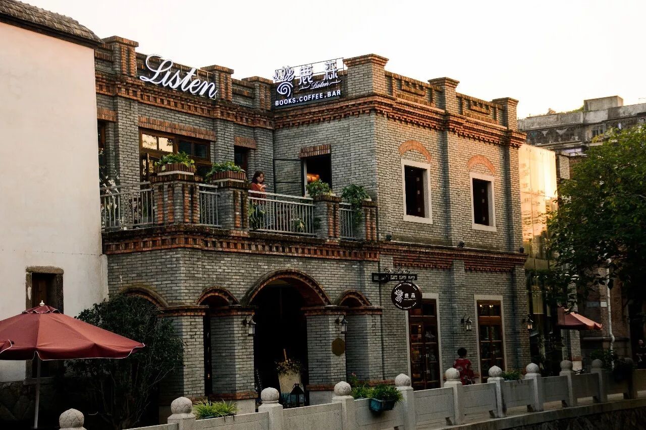 穿过静静卧在河面的三通桥,沿着三捷河向西行去,不出百米,就能看到墙面上挂着复古铜牌“鹿森”的青砖小楼。