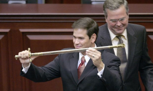 文章提到,這一故事源於2005年9月13日,當時的州眾議員盧比歐,正式成為佛羅里達州歷史上「首位古巴裔州眾議院議長」。在盧比歐的就職演講結束後,身為佛州州長的傑布,走到盧比歐的身旁,還帶著一支金劍。